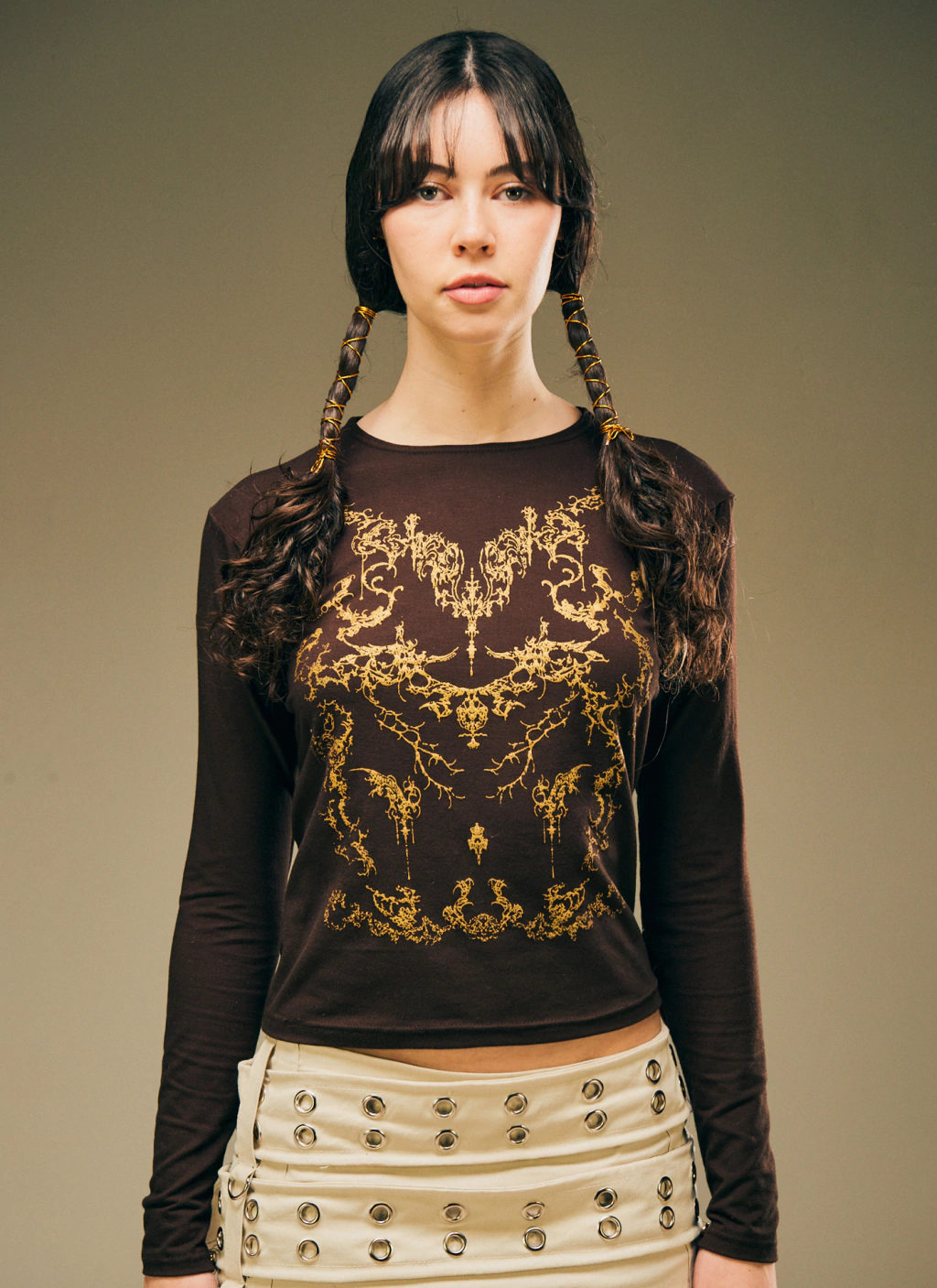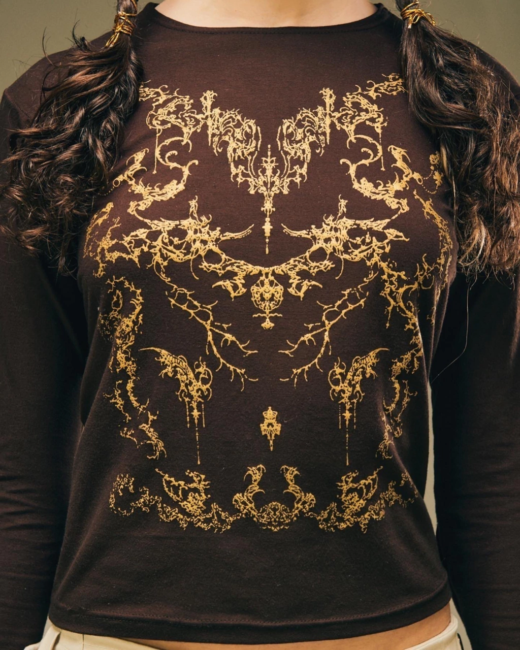Modal de algodon con lycra, color marrón, estampa dorada y botones dorados en las mangas.
