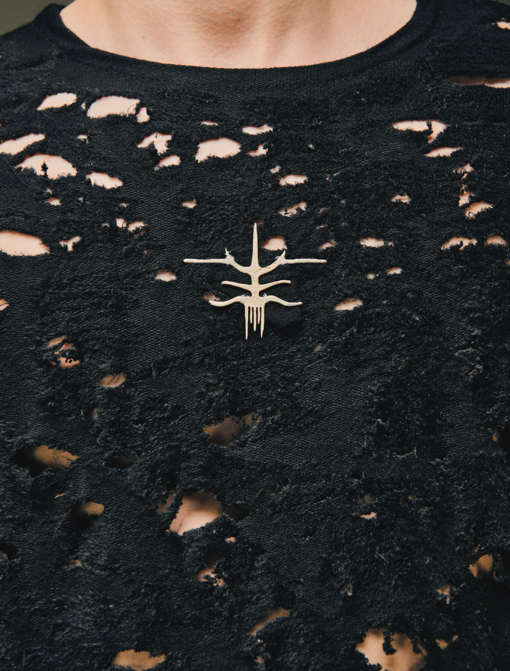 REMERA NEGRA DE ALGODON, RUSTICO. TEXTURA REALIZADA A MANO CON MINITORNO. LOGO METAL DE 6X6CM EN ALPACA.