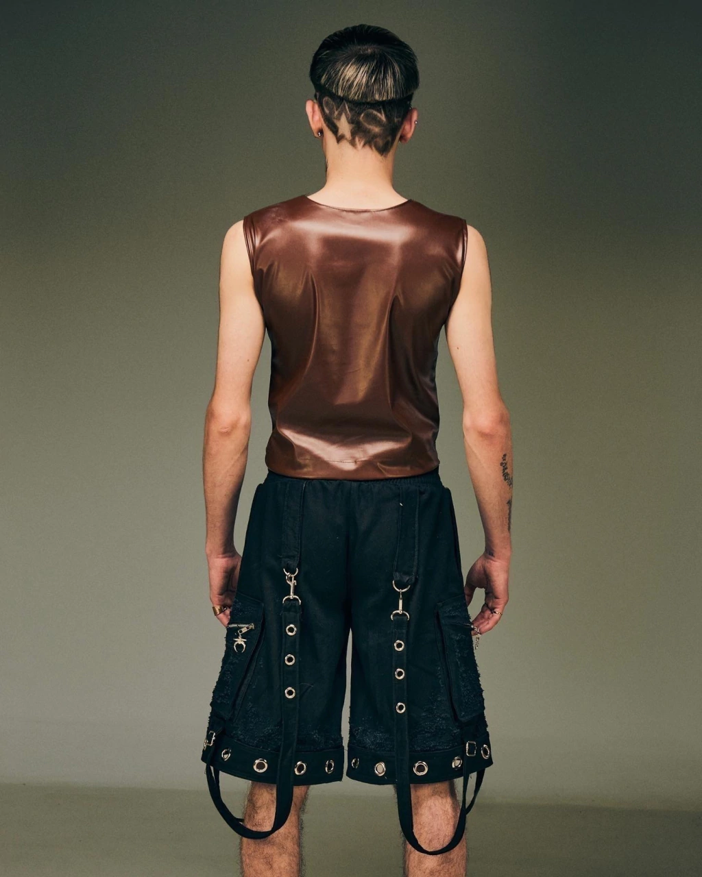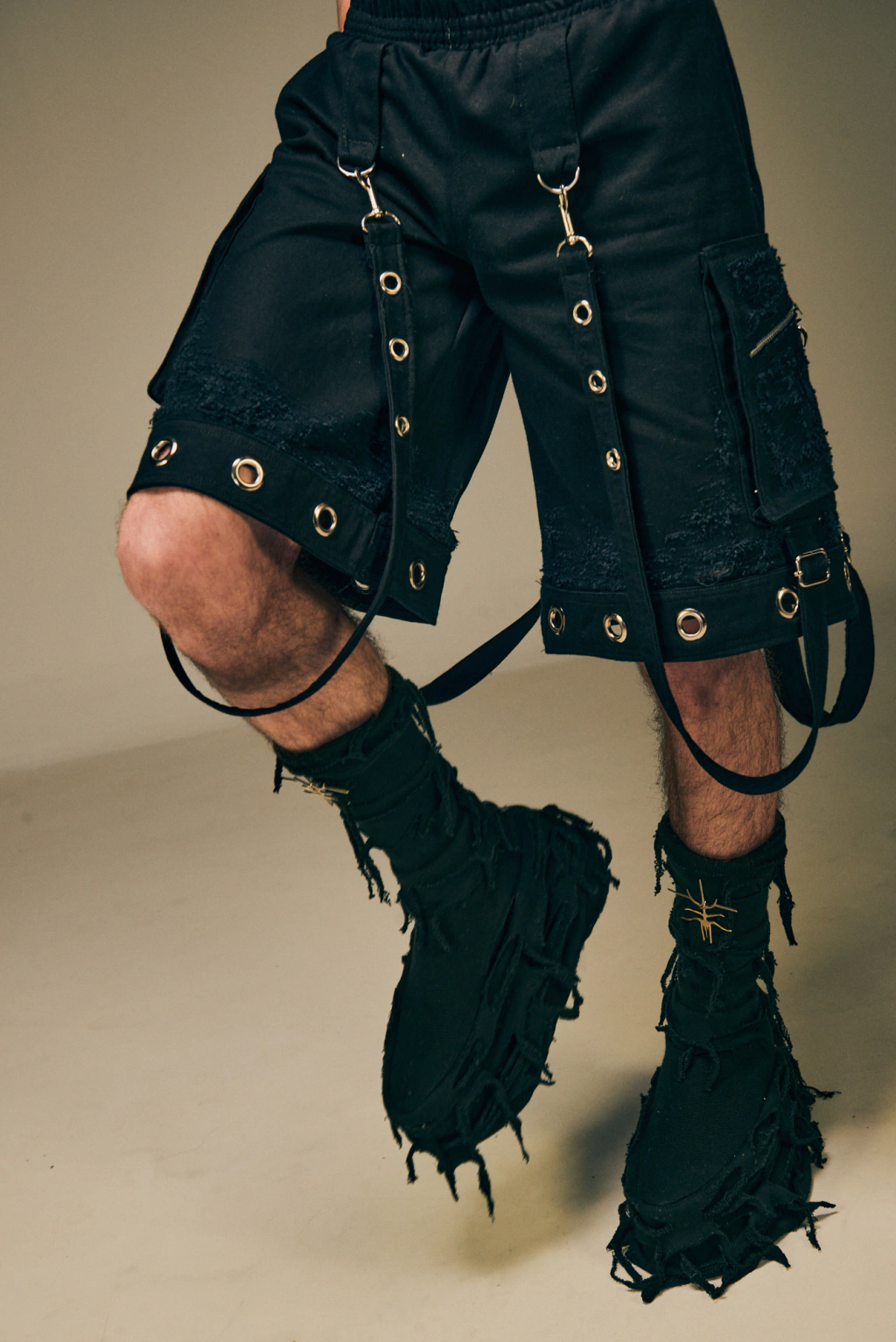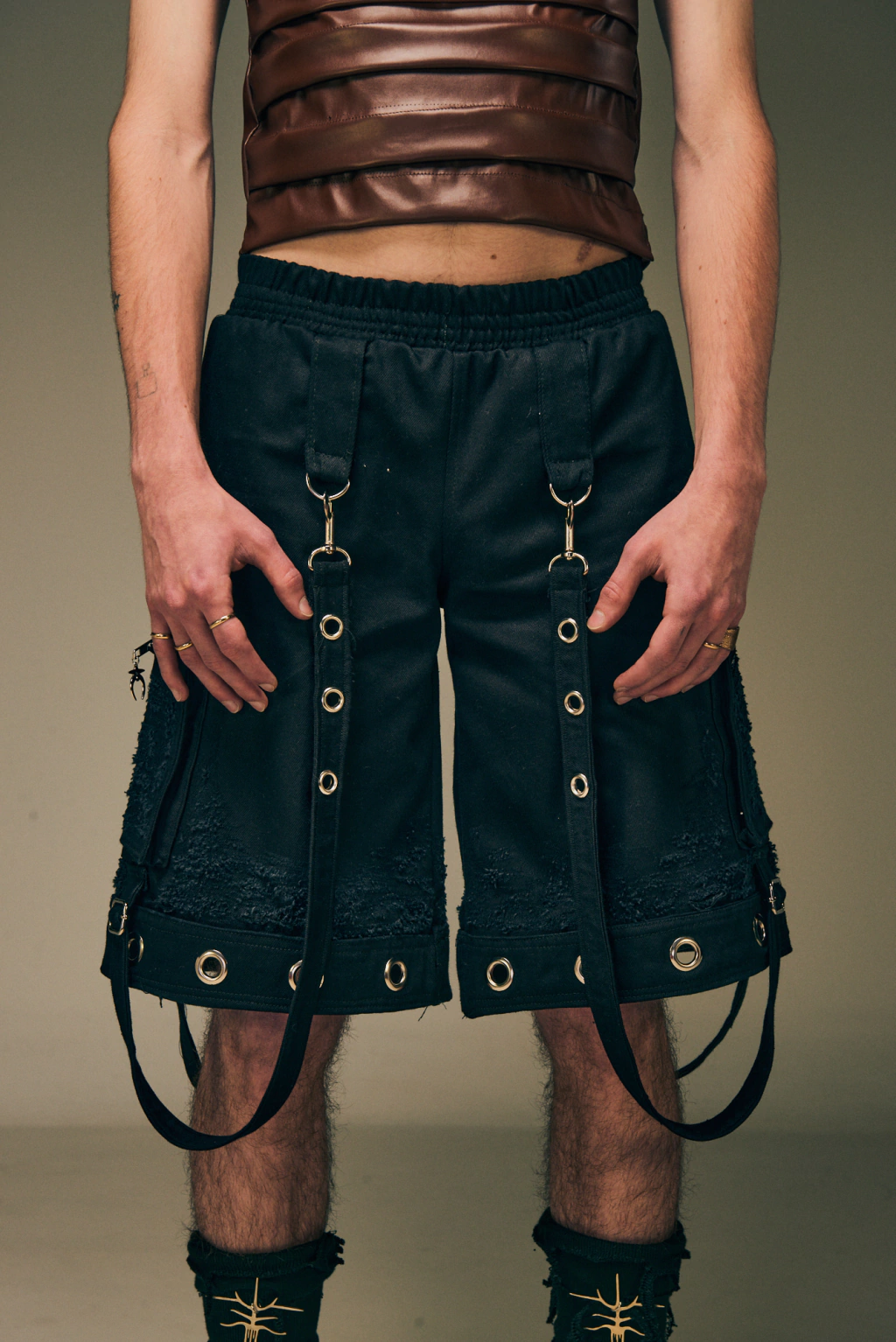 Bermuda negra en gabardina de 11 onzas negra, detalles metalicos y textura hecha a mano.
